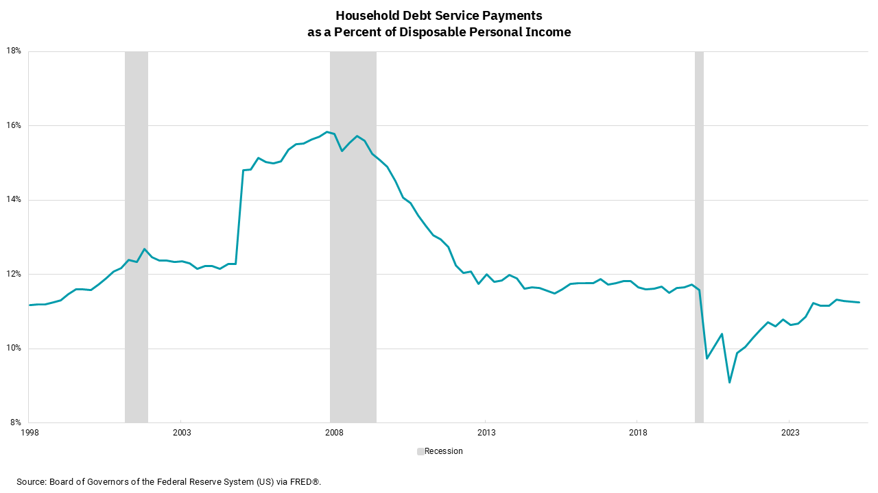 - While total consumer debt is at record highs, debt service levels remain manageable, though the strain unevenly distributed across income groups.