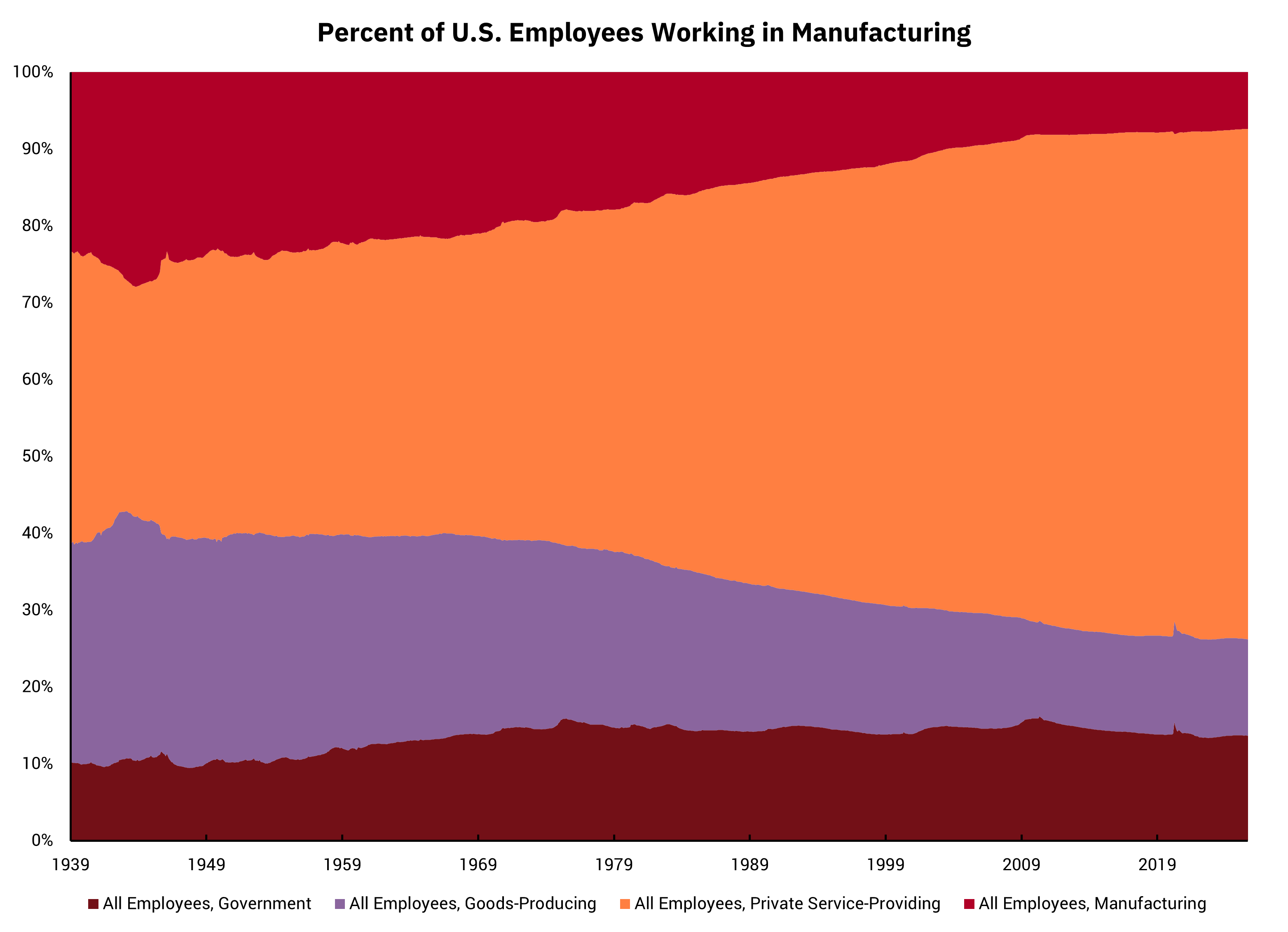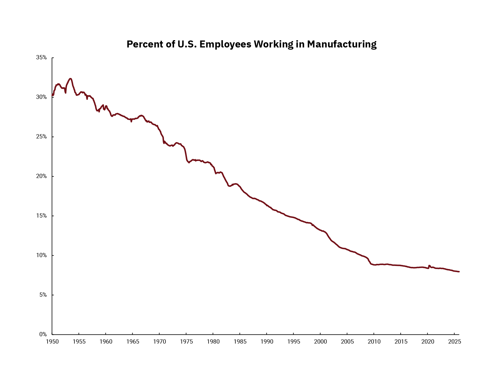 By comparison, in August 2025, only 13.6% of U.S. employees worked at a manufacturing jobs, which pay an average of $29 an hour, or $1,160 a week for a 40-hour work week, according to BLS statistics. In other words, although the pay for manufacturing jobs has increased over time, the percentage of Americans working in those jobs has decreased substantially.